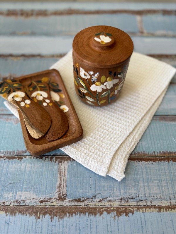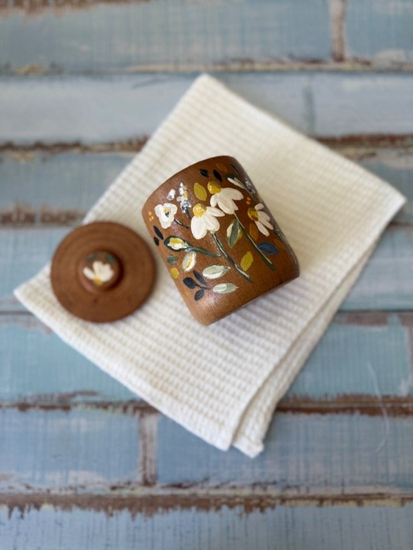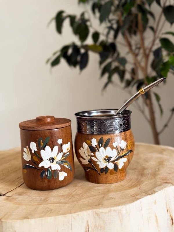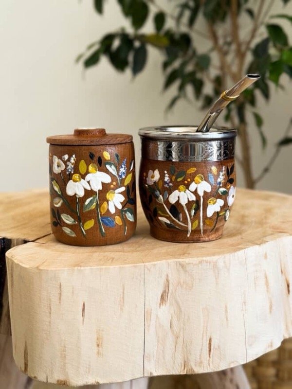 Azucarera Lilas, realizada en madera de alagarrobo, pintado a mano. Tapa y envase.